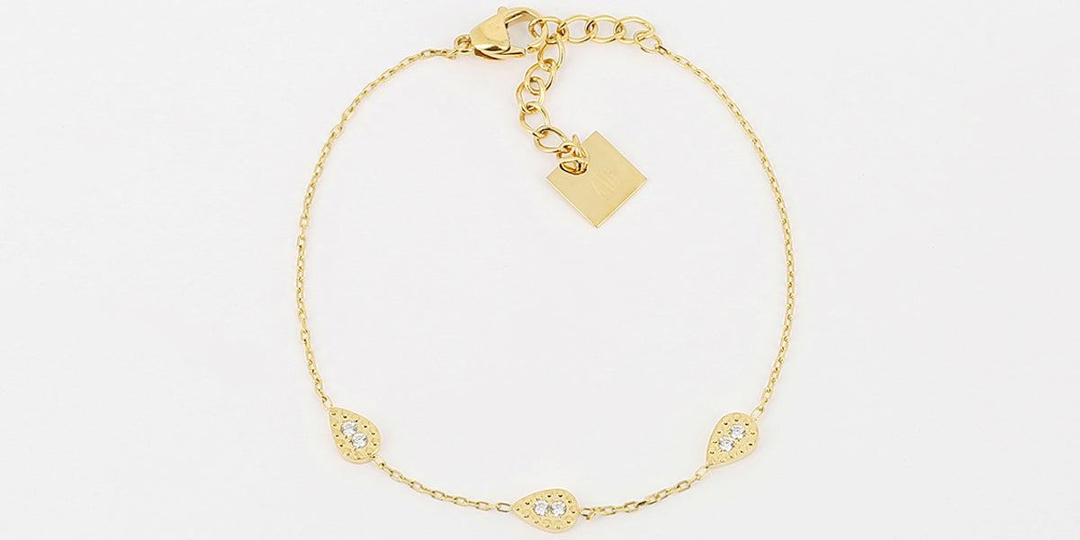 Bracelet en acier doré à l’or fin sur lequel trois petites gouttes ornées de zirconiums colorées sont attachées.