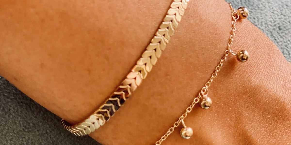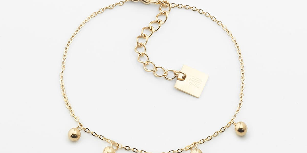 Bracelet chaînette en acier uni ou doré à l’or fin, sur lequel sont accrochées des petites boules de métal façon pampilles. Ce bracelet est un classique à porter mélangé avec d’autres bracelets chaîne ou jonc.