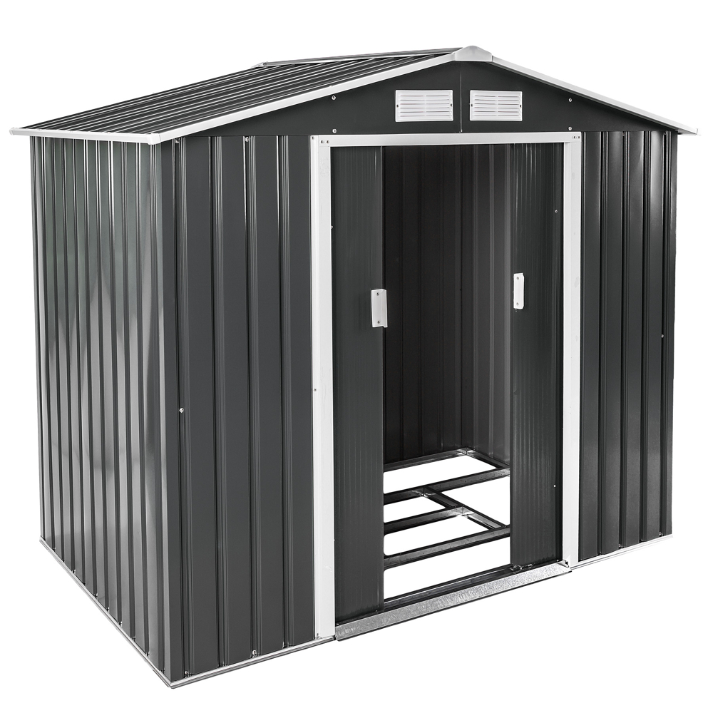 Protégez votre matériel de jardin des intempéries et des vols gr√¢ce à cet abri de jardin en métal spacieux de 2,7 m¬≤ avec toiture à 2 pans. La tôle en acier laqué et galvanisé assure une grande durabilité et une faible maintenance. Les portes coulissantes internes optimisent l’espace de rangement et peuvent être verrouillées avec un cadenas (non inclus). La fondation en métal assure une grande stabilité et les bouches d’aération permettent une bonne ventilation. Les dimensions totales sont d’environ 214 cm x 130 cm x 185 cm avec une hauteur de l’avant-toit d’environ 157 cm. Livré avec une notice d’installation illustrée.