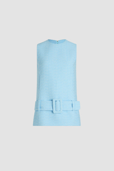 Skylight Blue lightweight cotton tweed dress. Mini length. Straight silhouette. Round neckline with zip fastening at the back. Sleeveless. Wide fabric belt designed to sit on the hips. High seam pockets at the front. Lined.