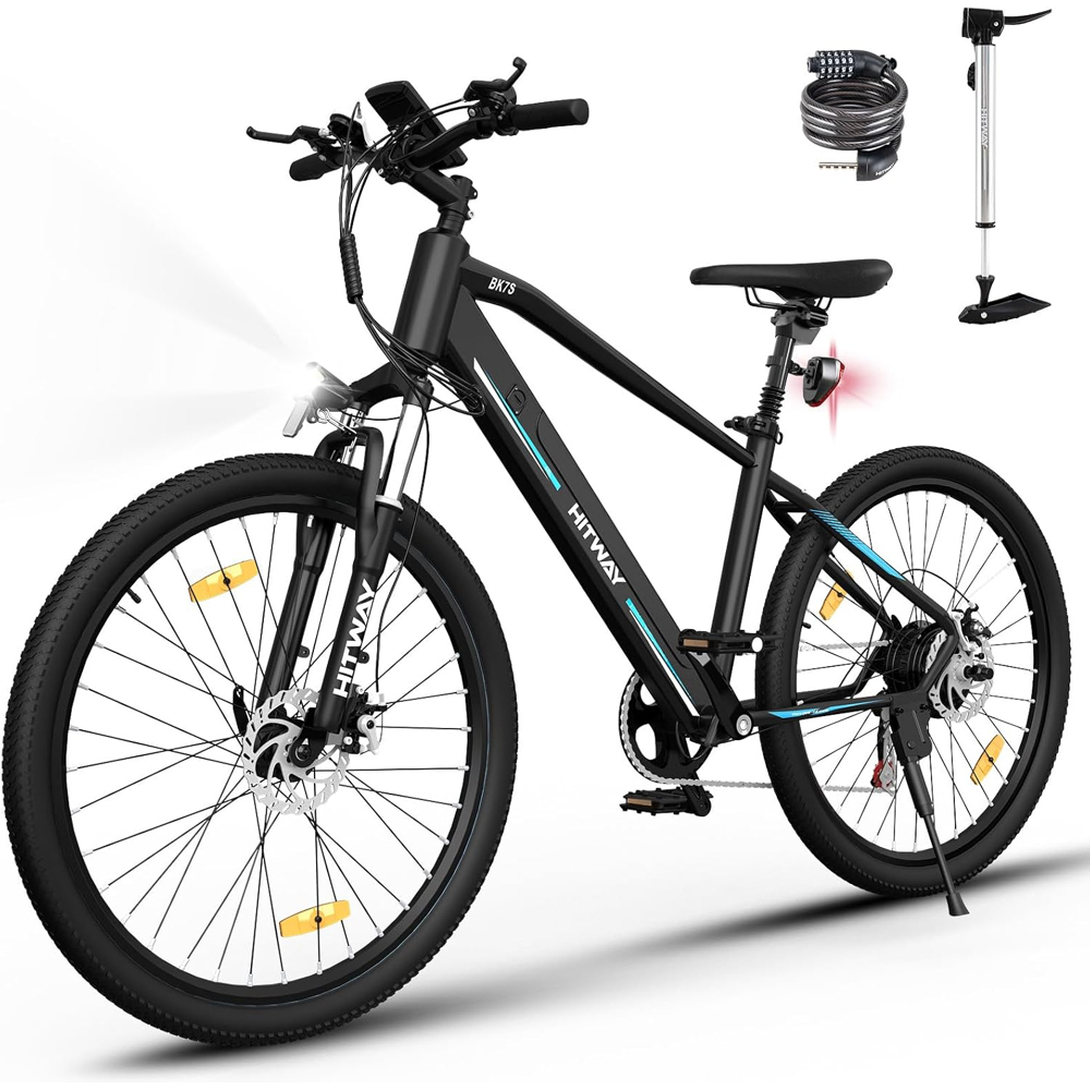 HITWAY Vélo électrique de Montagne 26″, vélo électrique Puissant 36V 12Ah 250W,7 Vitesses, vélos à Assistance électrique pour Adultes‚úîÔ∏èParamètre:Version standard‚úîÔ∏èCouleur:Noir‚úîÔ∏èTaille de dépliage:1770mm*680mm*1100mm‚úîÔ∏èFormulaire de jante:Roues à rayons métalliques‚úîÔ∏èTaille de roue:26 pouces‚úîÔ∏èMatériau du corps:Alliage d’aluminium‚úîÔ∏èTaille de l’emballage:1470mm*240mm*800mm‚úîÔ∏èBrut/Net:24.3kgs/30kgs Ôºà53.57lbs/66.14lbsÔºâ‚úîÔ∏èCharge maximale:120kg (264,55 livres)‚úîÔ∏èVitesse maximum:25Km/h (15,53 mph)‚úîÔ∏èKilométrage:35KM-90KM (affecté par la charge, la température, les conditions routières, le mode de conduite, etc. Par exemple: dans des conditions de 75 kg et 25 ¬∞C, l’autonomie maximale en mode électrique peut atteindre 35 KM, et l’autonomie du cyclomoteur dépend de la charge et du style de conduite)‚úîÔ∏èAngle d’escalade maximal:25 degrés‚úîÔ∏èTempérature appropriée:-10ÔΩû45‚ÑÉ‚úîÔ∏èNiveau étanche:IP54‚úîÔ∏èType de batterie:Batterie au lithium-ion 18650‚úîÔ∏èCapacité de la batterie:12Ah 36V‚úîÔ∏èPuissance nominale du moteur:250W‚úîÔ∏èForme motrice:Mode d’assistance‚úîÔ∏èType de moteur:Moteur sans balais 26 pouces/36 V/haute vitesse avec engrenage‚úîÔ∏èAffichage du compteur:√âcran LCD multifonctionnel‚úîÔ∏èPhare:OUI‚úîÔ∏èMéthode de freinage:Frein à disque avant + Frein à disque arrière ‚úîÔ∏èSpécifications des pneus:Pneus pneumatiques‚úîÔ∏èPneuÔºö26X2.35‚úîÔ∏èValve d’air : 26X2.35 La valve ‚úîÔ∏ède la chambre à air est AV‚úîÔ∏èFourche avant :Amortisseur de fourche avant‚úîÔ∏èEngrenage :Transmission 7 vitessesAttention : our rouler en toute légalité, les vélos électriques HITWAY ne sont pas équipés d’accélérateurs.