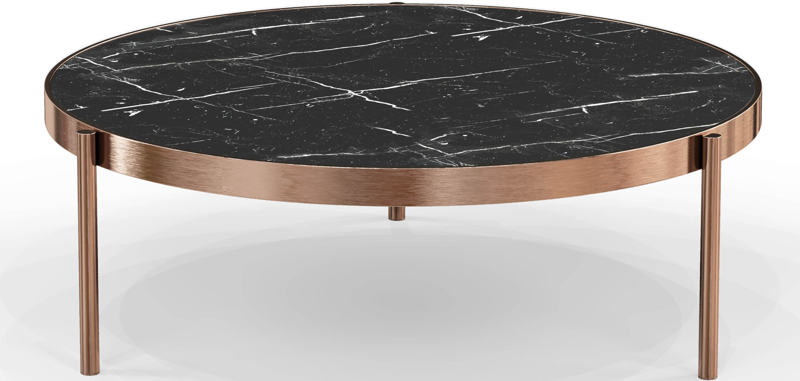 This round coffee table is a true gem in terms of style and functionality. With a generous-sized black marble base, measuring 90 cm in diameter and 30 cm in height, this table provides a wide and spacious surface for all your needs. The marble of the base, known for its natural beauty and durability, brings a timeless and superior quality appearance. Its dark tone creates a captivating contrast with the rose gold color of the stainless steel structure. Our premium-quality Louy table is ideal for hotels, commercial spaces, or for home use.
