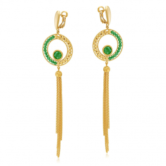 Ces boucles d’oreilles pendantes en or jaune 18 carats/750 millièmes forment un cercle composé pour moitié de perles en or et de cristaux de synthèse pour l’autre moitié. Un autre cristal rond repose sur le bord inférieur du cercle, support de pampilles qui oscillent délicatement au gré des mouvements de la femme qui les porte.
