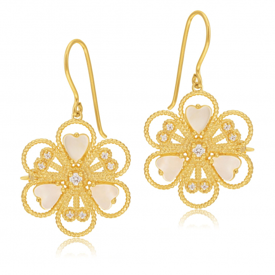 Le design complexe de cette paire de boucles d’oreilles en plaqué or lui donne un style baroque. Les lignes torsadées des bijoux dessinent une fleur dont trois des pétales accueillent un coeur en nacre blanche. Ces boucles d’oreilles pour femme évocatrices de l’amour vous sont proposées à un prix accessible.