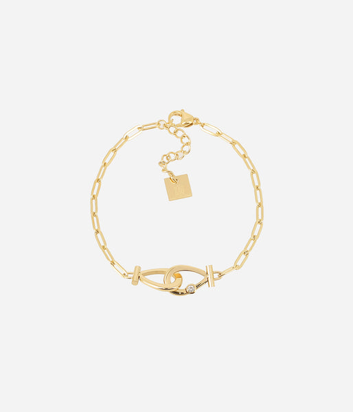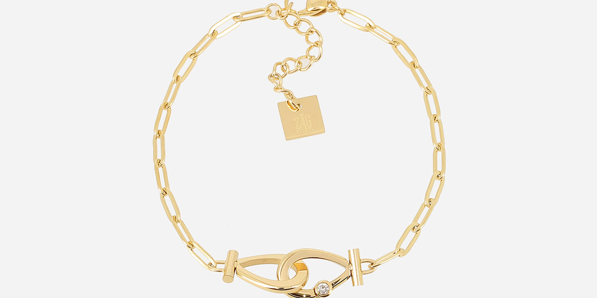 Bracelet maillons en acier doré à l’or fin où deux motifs sont entrelacés. Le zirconium apporte une petite touche d’éclat coloré.