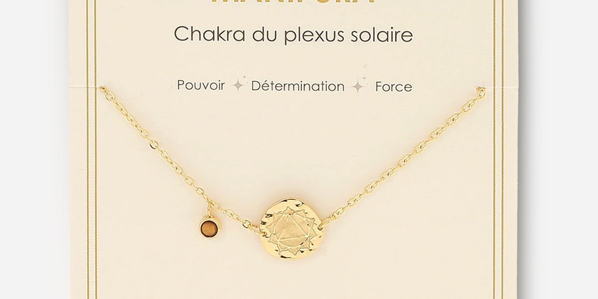 Bracelet en acier doré à l’or fin où une pastille martelée marquée d’un symbole représentant l’un des 7 chakras est attachée. Ici, le Chakra du Plexus Solaire est symbolisé par l’oeil de tigre.