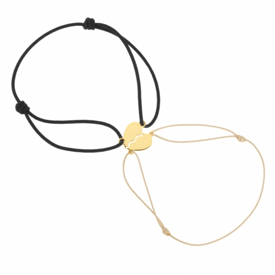 Ces 2 bracelets mixtes en or jaune 18 carats/750 millièmes portent chacun la moitié d’un coeur sécable. Les 2 parties complémentaires sont rattachées l’une à un cordon clair et fin, l’autre à un cordon noir plus épais. Partagez ce coeur avec un homme ou femme que vous estimez en lui offrant un de ces bijoux en cadeau.