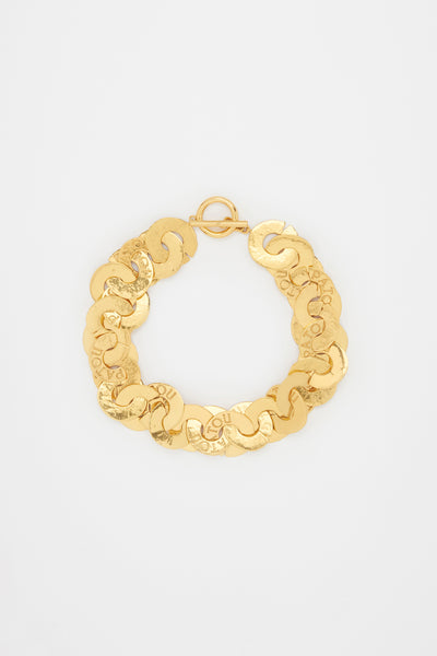 A golden treasure of pretty Patou coins. Gold-plated brass necklace. Antique coin inspiration. Hammered texture. Interlinked coin chain with-engraved Patou logo. T-bar closure.