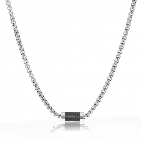 Faites ressortir votre virilité avec ce collier en acier pour homme. Les mailles petites et épaisses de la chaîne donnent l’illusion de perles assemblées les unes aux autres. Un cylindre en carbone noir et aux extrémités en acier est enfilé sur cette chaîne, donnant à ce bijou un esprit moderne.