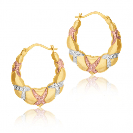 Cette paire de boucles d’oreilles en or jaune et rhodié 18 carats/750 millièmes joue sur le contraste des couleurs. Ces créoles larges, mais de petit diamètre, sont ornées de croix irrégulières en or rose et gris. Ces boucles d’oreilles au prix abordable font une belle idée de cadeau pour une femme.
