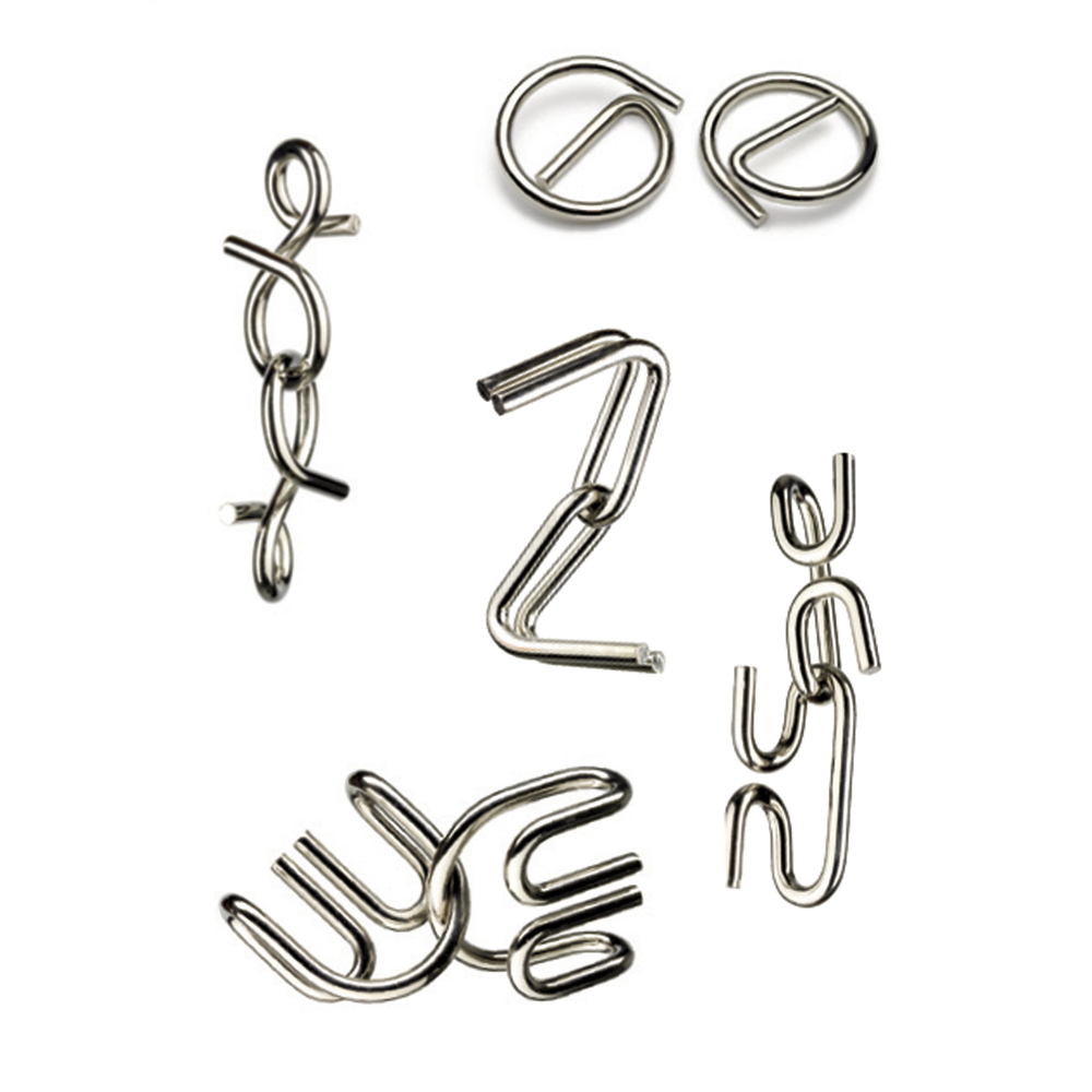 De beaux casse tête en métal pour mettre à rude épreuve les neurones.Fournis avec la solution.