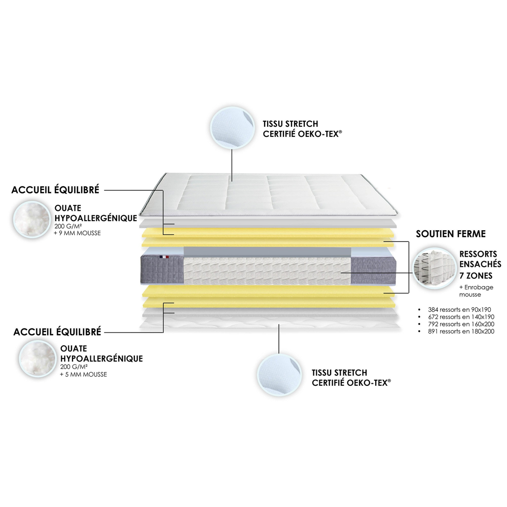 Matelas MAX Profitez d’une indépendance de couchage parfaite avec ce matelas à ressort MAX. Chaque ressort s’adapte indépendamment au mouvement de votre corps, pour votre plus grand confort. Vos muscles se rel√¢chent et une sensation d’apesanteur vous envahit pour des nuits paisibles. CARACTERISTIQUES MATELAS Matelas ressorts ensachés 7 zones de confort Epaisseur totale : 30 cm Soutien : Ferme Le soutien correspond au maintien du corps sur le matelas. Il est assuré par l’√¢me du matelas. Un matelas ferme permet de garder votre colonne vertébrale alignée. Accueil : Equilibré Ame du matelas : Ressorts ensachés Les ressorts ensachés sont emballés individuellement puis assemblés les uns aux autres. Ils s’adaptent ainsi aux mouvements du corps point par point et favorise l’indépendance de couchage. Fini les nuits perturbées par le mouvement de votre conjoint. Les ressorts permettent également une bonne qualité d’aération pour le matelas et participent ainsi à la durabilité du matelas. Nombre de ressorts : 660 ressorts en 140×190 775 ressorts ensachés en 160×200 868 ressorts ensachés en 180×200 Les ressorts sont isolés par 3 cm de mousse dessus/dessous. 7 zones de confort Profitez de 7 zones de confort différenciées pour un meilleur maintien du dos et un confort personnalisé selon les parties du corps. Zones : tête, épaule, lombaire, bassin, cuisses, jambes et pieds. Matelas réversible Les 2 faces de couchage sont matelassées sur 9mm de mousse + 400gr de ouate hypoallergénique Coutil : le plateau du matelas est composé d’un tissu 100% polyester au toucher très doux Finitions : 4 poignées Traitement : pour une hygiène parfaite, le tissu est traité anti-acariens, antibactériens et hypoallergénique Certifié OEKO-TEX Tous nos tissus sont certifiés exempts de substances nocives ou de produits chimiques par Oeko-Tex Garantie 5 ans CONSEILS ET RECOMMANDATIONS Entretien de votre matelas Ce matelas dispose de 2 faces de couchage, pensez à retourner votre matelas tous les 6 mois et à inverser tête et pieds tous les 3 mois pour optimiser sa durée de vie au maximum ! L’utilisation d’un protège-matelas + drap-housse permet également d’assurer à votre literie une protection optimale. Sommier Qu’il soit à lattes ou à ressorts, le sommier supporte un tiers du poids et des mouvements nocturnes. Il optimise les capacités du matelas et améliore sa durée de vie. Sommier : Sommier en bois massif déco épaisseur finie : 11/12cm hors pieds. Isolation sur du feutre pour renforcer le sommier et améliorer le confort 12 lattes rigides pour le couchage en 140x190cm. 13 lattes rigides pour le couchage en 160×200 et 180x200cm. Barre de renfort centrale. Toile de fond anti poussière. 5 coloris au choix : – Gris – Noir – Bleu denim – Vert céladon – Blanc Livré avec 1 seul sommier et 4 pieds de 12 cm bois brut en 140x190cm. Livré avec 2 sommiers et 8 pieds de 12 cm bois brut en 160x200cm. Livré avec 2 sommiers et 8 pieds de 12 cm bois brut en 180x200cm. Garantie 2 ans Face de couchage : traitement biocide : 2-octyl-2H-Isothiazol-3-one (26530-20-1) / Fatty alcohol C12-C15 ethoxylated (68131-39-5) Couette + oreillers : 2 OREILLERS 60×60 pour l’ensemble 140×1901 COUETTE 220×240 pour l’ensemble 140×190 2 OREILLERS 60×60 pour l’ensemble 160×2001 COUETTE 240×260 pour l’ensemble 160×200 2 OREILLERS 60×60 pour l’ensemble 180×2001 COUETTE 240×260 pour l’ensemble 180×200 Couette tempérée, parfaite pour une utilisation toute l’année. Enveloppe taffetas de polyester toucher soyeux 100% polyester Garnissage polyester tempérée 300 g/m ? Piq√ªres lignes droites Emballage sous sachet polyéthylène Lavable en machine sous 40 C Oreillers 60×60 – 100% Polyester Enveloppe 100% polyester blanc Garnissage polyester 100% Fabrication fran√ßaise pour des nuits sereines Certifié Oeko-Tex : un label international qui garantit que le produit fini ne contient aucune substance toxique et ceci tant pour les fibres synthétiques que naturelles. Emballage sous sachet polyéthylène Lavable en machine sous 40 C Fabrication fran√ßaise – Usine certifiée ISO 9001 Bois certifié PEFC ? PEFC certifie la gestion durable des forêts et rassemble autour d’une vision multifonctionnelle et équilibrée de la forêt dans 53 pays à travers le monde. Depuis 20 ans, PEFC France favorise l’>