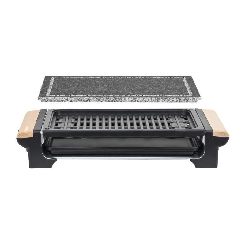 Fonction pierre a cuire gr√¢ce a sa pierre de marbre Fonction Grill gr√¢ce a sa grille de cuisson Surface de cuisson : 37*23 Température ajustable Poignées en bois Grille et bac de récupération amovibles Nettoyage facile Puissance 1300W Eco participation : 0,18Euros (incluse dans le prix)