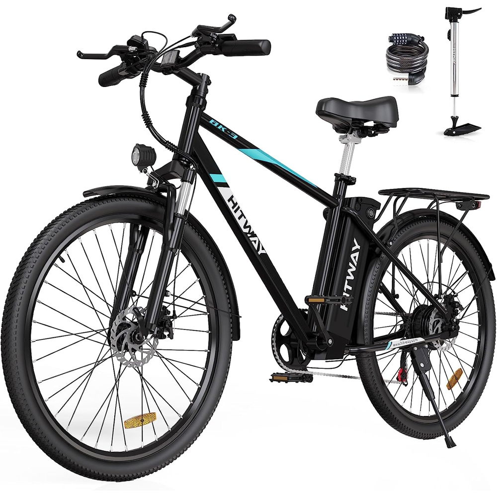 HITWAY Vélo √âlectrique,VTT √âlectrique 26 Pouces Hommes Femmes Moteur 250W,Batterie Lithium Amovible 36V/14Ah,7 Vitesses,E-Bike Urbain pour Adulte,jusqu’à 45-100km‚úîÔ∏èParamètre‚úîÔ∏èMatériau : acier au carbone‚úîÔ∏èTaille : 1830mm*630mm*1070mm‚úîÔ∏èTaille des roues : 26 pouces‚úîÔ∏èTaille d’emballage : 1530mm*240mm*785mm‚úîÔ∏èForme du moyeu : roue à rayons‚úîÔ∏èBrut/Net : 34,3/27,6 kg‚úîÔ∏èCharge maximale : 120 kg‚úîÔ∏èVitesse maximale : 25 km/h‚úîÔ∏èKilométrage : 45 KM-100 KM (affecté par la charge, la température, les conditions routières, le mode de conduite, etc. Exemple : à 75 kg et 25 ¬∞C, l’autonomie maximale en mode électrique peut atteindre 45 KM, et l’autonomie du cyclomoteur dépend de la charge et style de conduite)Angle d’escalade maximum : 25 degrés‚úîÔ∏èTempérature appropriée : -10~45‚ÑÉ‚úîÔ∏èIndice d’étanchéité : IP54‚úîÔ∏èCapacité de la batterie : 14 Ah‚úîÔ∏èTension nominale de la batterie : 36V‚úîÔ∏èPuissance nominale du moteur : 250W‚úîÔ∏èPneus : 26√ó2,125‚úîÔ∏èVitesse : Transmission 7 vitesses