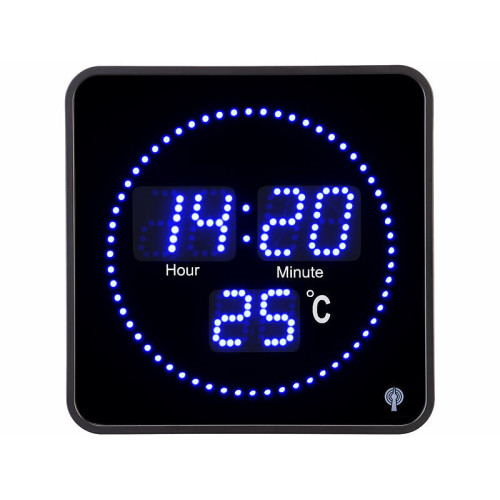Sur cette horloge déco au design épuré et moderne, 185 LED bleues tournent et clignotent autour de l’écran marquent les secondes alors que l’heure et les minutes sont en affichage fixe.Vous n’aurez plus besoin de penser à régler l’heure pour les passages d’heure d’hiver et l’été gr√¢ce au radio-pilotage (signal DCF77)L’écran lumineux avec de gros chiffres permet de voir l’heure même dans le noir.Vous pouvez le poser sur un meuble ou l’accrocher au mur.Le plus du produit:- Affichage lumineux avec grands chiffres- Radio-pilotage et température ambiante- Design moderne et soignéCARACT√âRISTIQUES :- Boitier compact et plat- Horloge à LEDS bleues (185 Leds dont 60 pour les secondes)- Taille du chiffre: 3.8 cm- Alimentation : par chargeur secteur 230 V- Modèle : chargeur secteur de ZX6697 : JL-E141- Tension d’entrée : 230 V AC- Fréquence d’entrée AC : 50 Hz- Tension de sortie : 9,0 V AC- Courant de sortie : 0,5 A- Puissance de sortie : 4,5 W- Efficacité moyenne en fonctionnement : 78,16 %- Efficacité à faible charge (10 %) [si supérieure à un chargeur 10 W] : 77,47 %- Puissance absorbée en cas de charge nulle : 0,13 W- Dimensions: 20 x 20 x 3.5 cm- Adaptateur secteur 230V et mode d’emploi FR fournis- Poids : 623 gPRECISION = cette horloge fonctionne sur secteur uniquement !