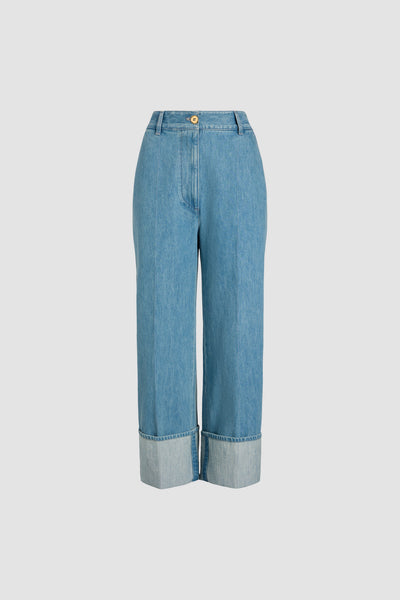 An Ice blue cotton denim rendition of Patou’s iconic straight-legged trousers. Contrast stitching all over, gold-tone Patou.engraved button and zip fastening at the front. Belt loops, two pockets at the sides. Signature darts at the back.