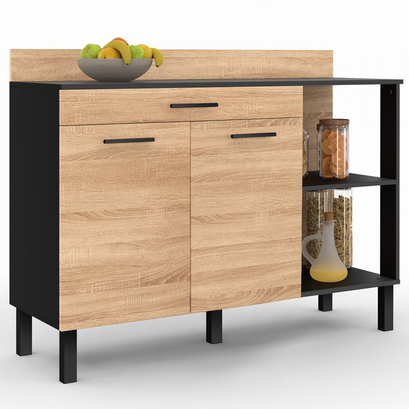 Choisissez le buffet de cuisine CINA au design tendance et moderne pour aménager votre intérieur. Sa structure noire et ses portes fa√ßon hêtre s’accorderont parfaitement dans votre pièce de vie. Ce meuble est doté d’un large plan de travail de 120 x 40 cm, idéal pour cuisiner de bons petits plats pour toute la famille. Optimisez votre espace en utilisant ses 2 étagères, son large placard et son tiroir. Privilégiez le placard situé en bas de la structure pour stocker vos plats les plus lourds et encombrants. Vous disposez d’un large stockage de 80 cm de longueur avec une étagère ajustable sur 3 niveaux. Le tiroir de 80 cm de longueur vous permet de stocker l’ensemble de vos couverts et de vos pelles à tarte, fouets et autres outils de cuisine.2 étagères viennent compléter ce meuble et pourront accueillir vos épices ou aliments stockés en vrac, tout en les gardant à portée de main. Faites-vous plaisir et choisissez le meuble pratique et esthétique pour votre cuisine. Plus qu’un simple meuble de rangement, le buffet de cuisine CINA vous permet de stocker et de garder à portée de main tout le nécessaire de votre cuisine. Dimensions du buffet de cuisine CINA 120 CM – H. 93 cm Dimensions globales : Longueur 120 cm x largeur 40 cm x Hauteur 93 cmDimensions intérieures placard : L. 77 x l. 36.50 x H. 53 cm avec 1 étagère amovible sur 3 niveauxDimensions intérieures tiroir : L. 72 x l. 33.50 x H. 5.50 cm – Fa√ßade H.10 cmDimensions étagères extérieures : L. 36.50 x l. 40 x H. 32 cmHauteur du plan de travail : H.83 cmHauteur pied : 15 cmHauteur rebord : 10 cmDimensions fa√ßade portes : L. 40 x H. 56 cm2 poteaux intérieurs : 5 x 2.5 cmPoignée de 14 cm de longueurMatériaux : panneaux de particules + pieds en métalColoris : noir et bois√Ä monter soi-mêmeVisserie incluse Retrouvez l’ensemble de nos éléments de cuisine et buffets sur notre boutique en ligne !Retrouvez également le buffet bas de cuisine structure fa√ßon hêtre et portes noires.