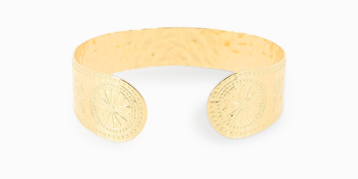 Le métal est travaillé dans un effet de gravure donnant à cette pièce une allure vintage. Cette pièce majeure de notre collection est parfaite pour un look ethnique chic.