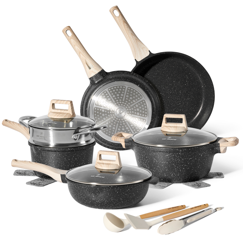 JUST PERFECTO Batterie de cuisine induction – set de casseroles tout feux avec couvercle en verre – anti adhesive – poele sans PFOA et sans PTFE