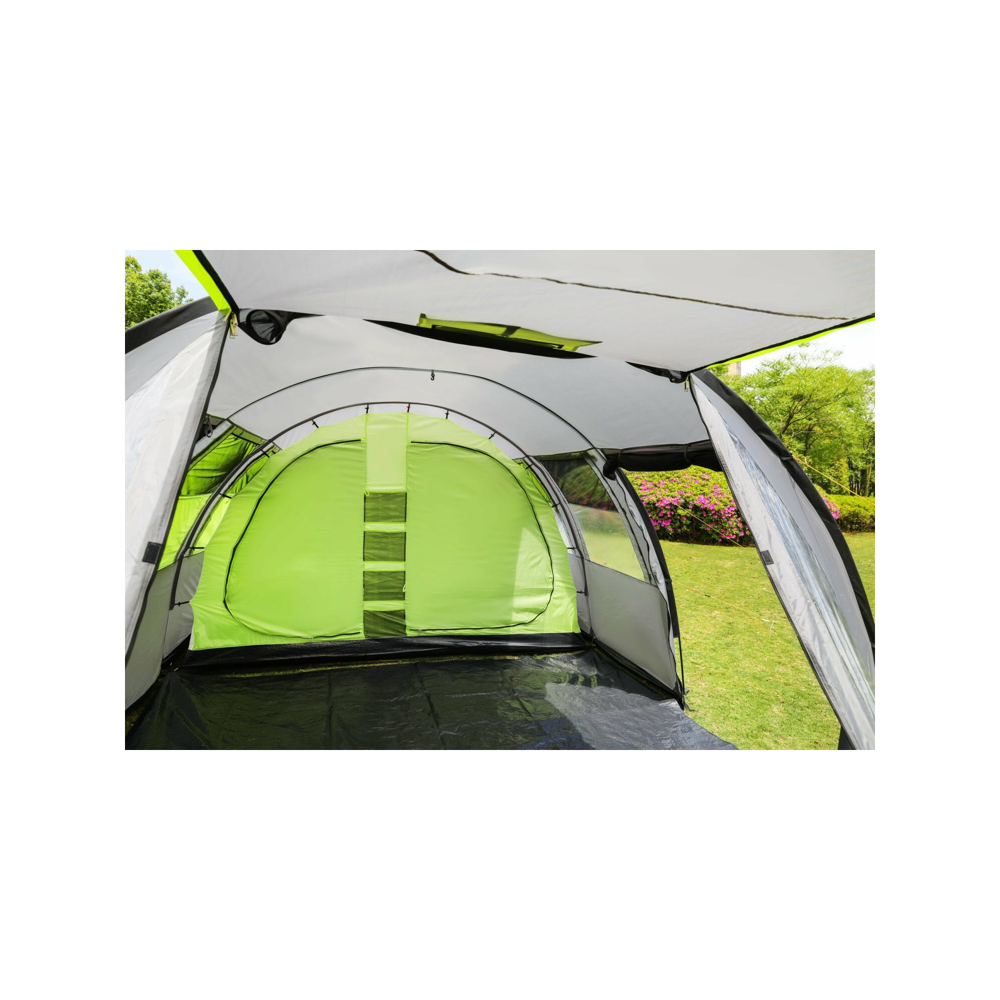 Tente Tunnel – 1 grande séjour – 2 chambres – 4 fenetres – Auvent – 5.000 mm schmerbers – Toile extérieur : 185T Polyester ripstop, revetement PU – Toile intérieur : 185T Polyester – Tapis de sol : PE 125 g/m¬≤ – Chambre: 210 x 300 cm – Armature : 11/9.5 mm fibre de verre 16 mm acier – Dimensions repliées : 73 x 32,5 x 32,5 cm.
