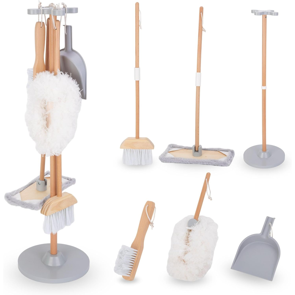 Kit de nettoyage Enfant Amuse et apprend à votre enfant à garder son espace de jeu propre.Les enfants adorent imiter les adultes, c’est pourquoi cet ensemble de nettoyage en bois durable leur plaira à coup s√ªr. De nombreux accessoires tels qu’ une serpillière, un balai et une pelle à poussière permettent aux tout-petits d’accompagner leurs parents dans les t√¢ches ménagères quotidiennes, tout en les amusant et en leur apprenant que s’occuper de la propreté peut être très amusant !Caractéristiques principales :ensemble en bois de haute qualitédesign minimalistetrès résistant aux dommagesle support stable permet de ranger facilement les accessoires de nettoyageconvient aux enfants de plus de 3 ansLe set de nettoyage en bois permet aux enfants de jouer le rôle d’assistant de leurs parents, ce qui renforce leur confiance en eux et leur donne l’impression d’être utiles. En participant aux t√¢ches ménagères et en imitant les adultes, le jeune enfant apprend la responsabilité et acquiert des compétences de base, telles que la propreté de la maison. Le jouet l’aide à prendre l’habitude de ranger son environnement.Jouer à nettoyer développe:l’imaginationles compétences en matière de jeux de rôlel’habileté manuellela précision des mouvementsle sens de l’actioncoordination ≈ìil-maincapacité de concentrationl’équilibreL’ensemble comprend :un support de rangement en boispelle à poussièrebalaiserpillière avec housse souple (la housse peut être facilement enlevée et lavée à la main) balai à poussière (le tissu peut être facilement enlevé et lavé à la main) balayeuseSpécifications :Dimensions : 23,5 cm (L) x 23,5 cm (l) x 82 cm (H) Longueur du balai : 56 cmLongueur du balai : 65 cmMatériau : bois massif, MDFDimensions de l’emballage : 42 x 13 x 26,5 cmSécurité :Fabriqué avec un grand souci du détail, le jouet ne présente pas d’arêtes vives. Il répond à toutes les exigences de sécurité en vigueur dans l’UE, y compris la directive CE et la norme EN71. Sa surface a été recouverte de peintures non toxiques.