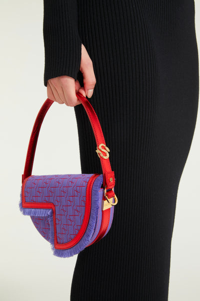 Violet denim-effect recycled organic cotton and red metallic leather handbag. Part of a special collaboration with DJ and designer Sita Abellán. Crafted using premium deadstock leather. Half-circle shape with geometric cut-outs inspired by the JP monogram. Allover JP quilting in red. Gold-tone hardware with Patou-engraved detail at the side. Leather outline with fringed edges. Removable leather strap adorned with Sita’s signature snake that allows it to be worn on the shoulder or carried by hand. Might be replaced by a gold-tone brass chain strap (sold separately) adorned with Patou letter charms and Sita’s snake symbol; the chain can be used as single or double length and worn on the shoulder, across the body or at the waist to turn Le Petit Patou into a belt bag. Magnetic closure with gold-tone JP detail. Internal compartment. Eco lining.