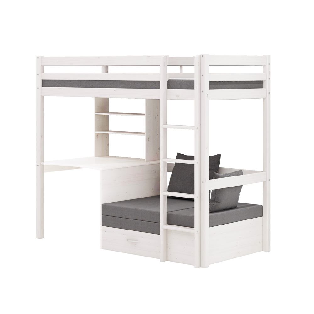 Lit mezzanine pour enfant avec canapé, bureau et bibliothèque blanc/gris clair est un lit pour enfant de couleur blanche qui apporte à la fois style et fonctionnalité à votre maison. Lit mezzanine Kids avec module canapé, lit d’appoint, bureau et bibliothèque. Le canapé est con√ßu pour que vous puissiez le retirer rapidement et facilement pour un espace de couchage supplémentaire. Vous décidez vous-même si le canapé, l’échelle ou le bureau doivent être placés à droite ou à gauche. Solution fonctionnelle, intelligente et peu encombrante. Sommier à lattes et matelas pour canapé, lit d’appoint inclus. 2 coussins décoratifs inclus. Sommier à lattes et matelas pour le lit supérieur, vous pouvez acheter sur cette page. Le lit surélevé est certifié EN747 par l’UE avec un sommier à lattes 27-82-30002 pour le lit supérieur. Profondeur hors échelle 98 cm. Profondeur avec échelle 104 cm. Profondeur du canapé allongé pour lit d’appoint 188 cm. Dimensions du matelas dessus de lit 90 x 200 cm (matelas et sommier non inclus). Dimensions du matelas canapé lit 188 x 75 cm (matelas et sommier à lattes inclus). Les pieds mesurent 5,5 cm x 5,5 cm. Bureau : Largeur – 86 cm, hauteur – 75 cm, profondeur – 95 cm. Espace ouvert à droite : Largeur – 86 cm, hauteur – 75 cm, profondeur – 95 cm. Ce produit est créé avec un souci du détail, ce qui garantit à la fois un attrait esthétique et une grande durabilité. Il est con√ßu dans un souci à la fois de fonctionnalité et de style, ce qui en fait le choix parfait pour n‚Äôimporte quelle pièce de votre maison. Les matériaux utilisés sont de haute qualité, ce qui confère au produit une longue durée de vie et lui permet de résister à une utilisation quotidienne. Que ce soit pour le rangement ou comme ajout décoratif, ce produit rehaussera votre décor et apportera plus de confort et d’élégance à votre maison.