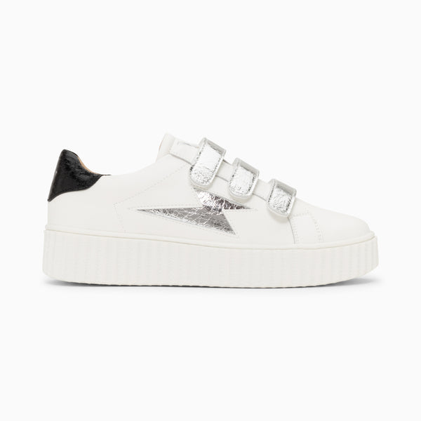 – White faux leather sneakers – Lightning shaped cutout and velcro closure in silver textured faux leather – Black heel notch – Round toe – White creeper sole Heel height: 4 cm Platform height: 3 cm Upper height: 6 cm This style runs true to size; we recommend ordering your usual size. If ordering half sizes, we recommend ordering the next size up.