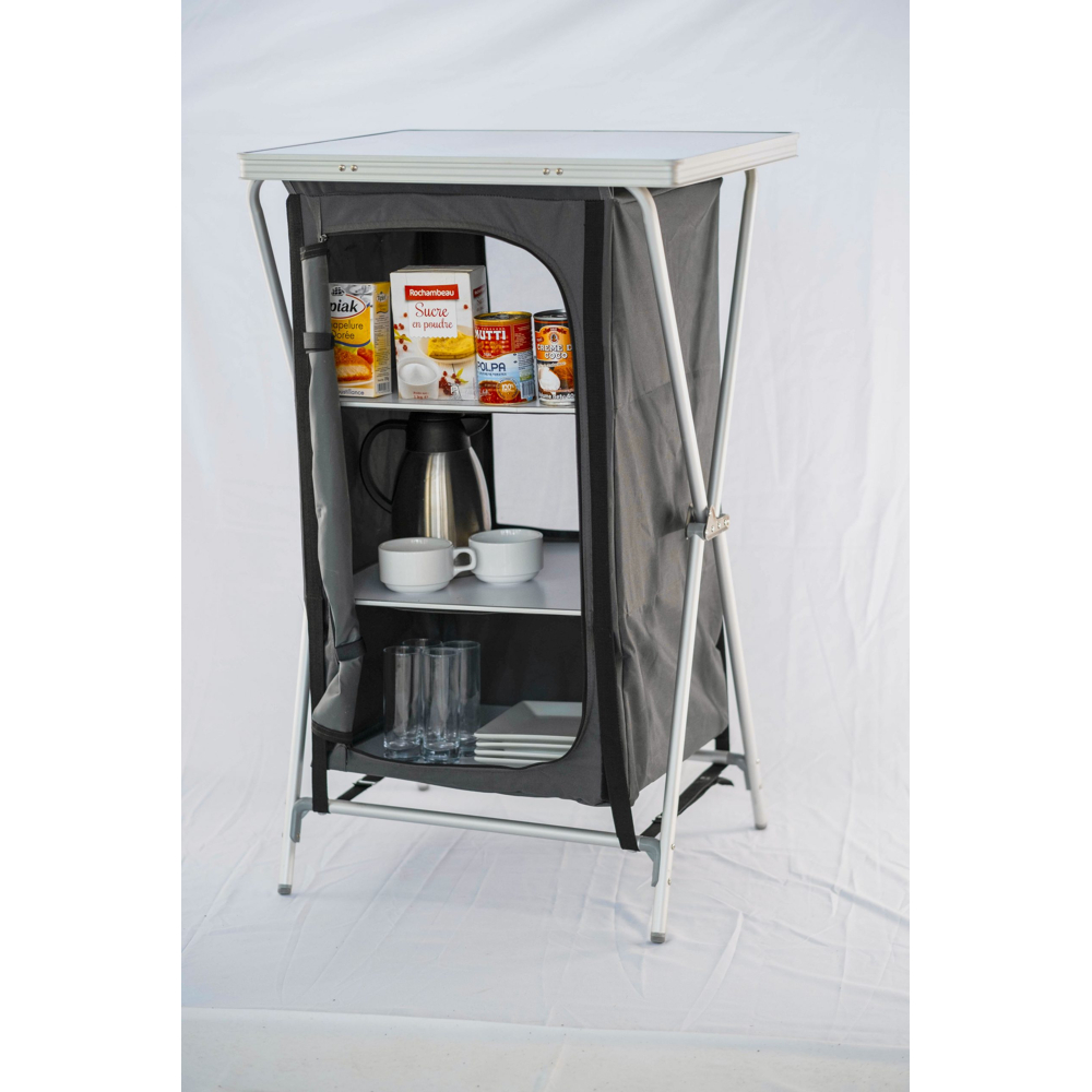 Le meuble de cuisine de camping O’Camp est un accessoire pratique et fonctionnel pour les campeurs, les randonneurs, les voyageurs et les amateurs d’activités en plein air.Doté de 3 étagères profondes de 50 cm, il offre un espace de rangement généreux pour vos ustensiles de cuisine, vos aliments et vos provisions. Gr√¢ce à sa structure en aluminium papillon, le meuble est léger et facile à transporter, tandis que son plateau en MDF résistant vous permet de préparer vos repas en toute sécurité.Le système d’ouverture à zip facilite l’accès aux étagères, tandis que les deux sangles d’attache garantissent la stabilité du meuble pendant les préparations et les utilisations.Le meuble se replie facilement en quelques secondes pour un rangement pratique et peu encombrant dans votre voiture ou votre sac de camping.Caractéristiques :Dimensions dépliée : 60 x 50 x H97 cmDimensions pliée : 60 x 50 x 15 cmPlateau en polyester MDFStructure en aluminiumToile extérieur en PVC Oxford 600 x 300DPoids : 6.5 KgCharge maximal du plateau : 30 KgLivré dans son sac de transport intelligent pour l’emmener facilement durant vos déplacements.