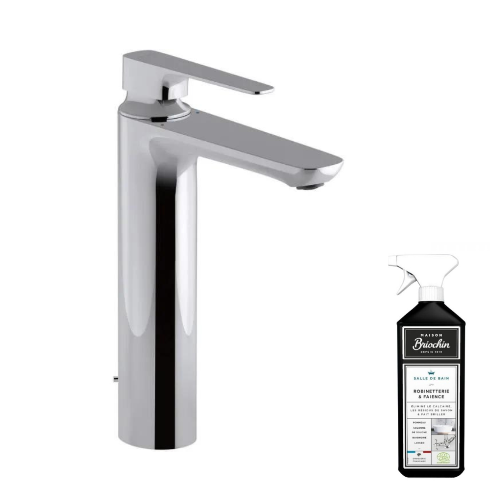 Avantages de votre mitigeur haut Aleo+ avec vidage Design moderne : épuré et contemporain, s’intègre facilement dans divers styles de salle de bains.√âconomie d’eau : débit limité à 5 l/min, réduit les éclaboussures et permet de faire des économies.Anti-calcaire : mousseur con√ßu pour éviter l’accumulation de calcaire, garantissant une performance durable.Système de sécurité : bague-limiteur de température pour prévenir les risques de br√ªlures.Facilité d’installation : vendu avec flexibles d’alimentation, simplifie le processus de mise en place.Garantie : 5 ans pour une tranquillité d’esprit. Caractéristiques techniques de votre votre mitigeur haut Aleo+ avec vidage Type d’installation : robinet monotrou sur plageMécanisme : cartouche à disques céramique pour durabilité et soliditéDébit : 5 l/minAérateur : anti-calcaireVidage : AvecNombre de mitigeurs haut Aléo+ dans le pack : 2Dimensions :Hauteur du robinet : 26,9 cmHauteur sous bec : 21,2 cmProfondeur du bec (saillie) : 15,7 cmFlexibles : inclus Avantages du nettoyant robinetterie & fa√Øence BRIOCHIN 750mL Ecocert Nettoyant 99,9% d’origine naturelle, certifié EcocertParfum pin d’origine naturelleProduit 2 en 1 : peut s’utiliser dans toute la salle de bain pour la robinetterie comme pour la fa√ØenceElimine facilement et rapidement le calcaire, les saletés et autres dépôtsFait briller la salle de bainConditionnement en spray pratique à utiliser