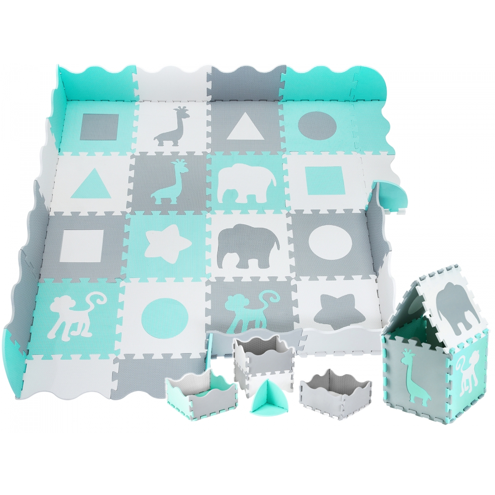 Tapis puzzle 150 x 150 cm, idéale pour bébés à partir de 0 √¢ge, enfants et adultes. Composé de 16 pièces avec une taille d‚Äôenviron 32 x 32 cm la pièce. La bordure est aussi composée de 16 pièces. Une variété de couleurs et de formes qui rajoute de l‚Äôambiance et de la fraicheur à vos intérieurs, et de l‚Äôactivité à votre quotidien.Casse-têtes en deux piècesChacune des 16 pièces se compose de deux parties : le véritable puzzle carré et la forme à l‚Äôintérieur, qui peut également être retirée. Les formes sont divisées en figures géométriques (carré, cercle, triangle et astérisque) et animaux (éléphant, singe et girafe).Les Avantages d‚Äôun Tapis Puzzle:les tapis puzzle présentent un certain nombre d‚Äôavantages par rapport aux tapis pliables et enroulables.Pratiques à ranger ‚Äì après avoir séparé et empilé les éléments les uns sur les autres, ils prennent peu de place.Malgré sa grande épaisseur, il n‚Äôy a aucun problème à le porter ou à le transporter, même dans une petite voiture.La taille du tapis est fournie à titre d‚Äôexemple seulement. Gr√¢ce à la possibilité de combiner des éléments de diverses manières ‚Äì pas seulement rectangulaires ‚Äì le tapis peut être adapté aux conditions spécifiques et à l‚Äôespace disponible.Les enfants apprennent à tenir et à faire correspondre les puzzles les uns aux autres.En disposant les éléments, ils développent leur motricité et développent leur imagination.Les enfants plus √¢gés peuvent utiliser les puzzles pour construire de petites et grandes structures selon leurs idées.Les éléments en mousse sont très légers ‚Äì ils ne représentent aucune menace si la tour ou la ¬´ tente ¬ª construite se renverse.Cela fait du tapis de puzzle un excellent jouet pendant de nombreuses années !Pourquoi choisir un tapis sous forme de puzzle en mousse :Il est sans limite d‚Äô√¢ge, dès les premiers jours de la vie !Fabriqué en mousse EVA d‚Äôorigine de la plus haute qualitéTrès grande taille une fois pliéConfortable ‚Äì environ 1 cm d‚Äôépaisseur ! Le tapis est facile à nettoyer. N‚Äôabsorbe pas les liquides renversés. Il suffit d‚Äôessuyer la surface du tapis avec un chiffon humide pour réussir à éliminer toute saleté.Il est Imperméable et a une structure antidérapante Il isole du sol froid et absorbe les chocs en cas de chuteConvient partout, parfait pour une chambre d‚Äôenfant, un salon, un balcon ou même un jardin.Sécurité ‚Äì Le tapis EVA est inodoreIl peut être utilisé par les personnes allergiquesIl est Antibactérien100% s√ªr, il ne contient pas d‚Äôingrédients indésirables, par exemple le formamideLa sécurité est garantie par le certificat européen CE et les tests EN71.
