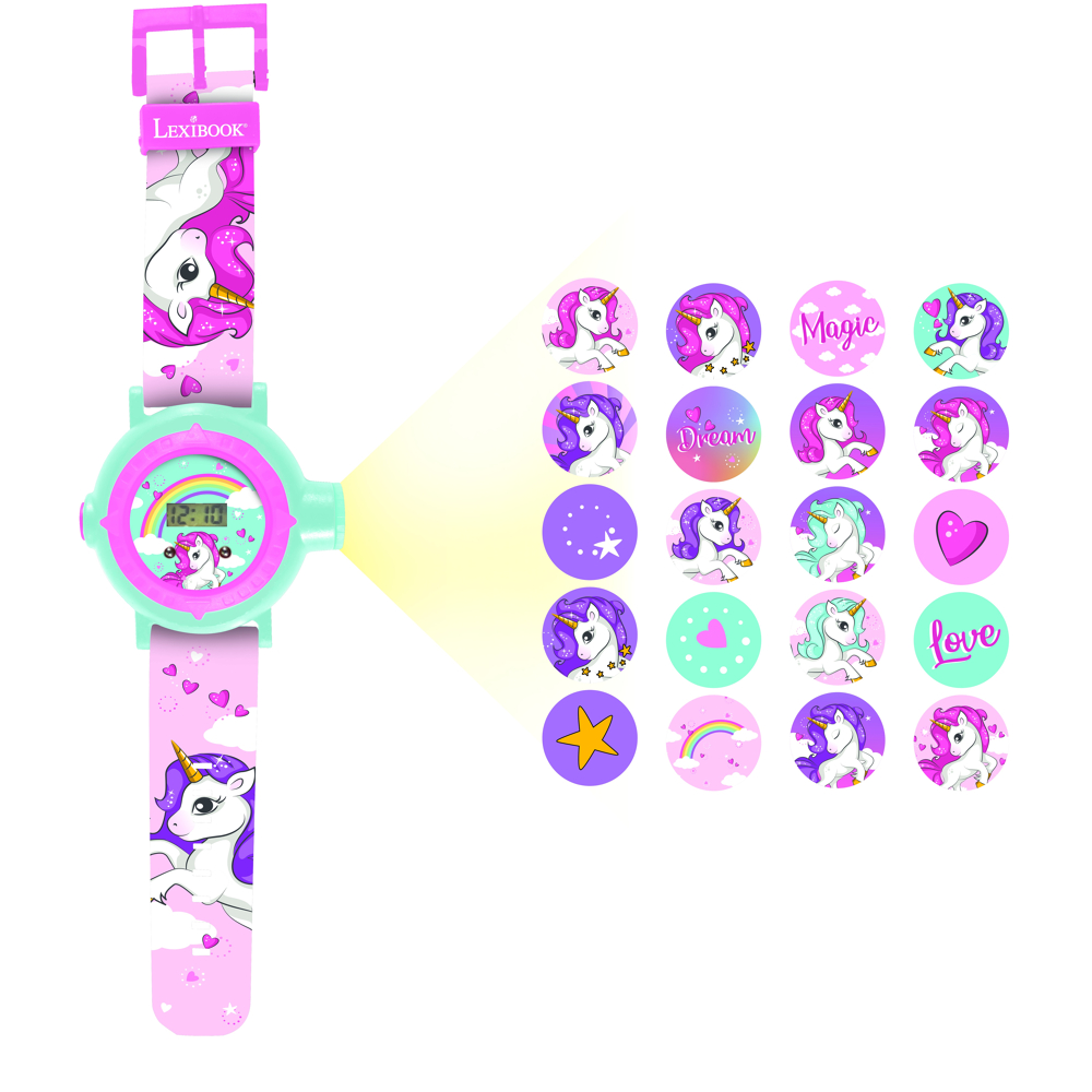 * Une montre digitale avec design Licorne !* 20 images de l’univers magique et féérique des licornes à projeter o√π tu veux* Communique avec tes amis en envoyant des messages codes avec tes projections préférées* Bracelet ajustable, convient parfaitement aux petits poignets* Anneau rotatif pour choisir l‚Äôimage à projeter* Affichage de l‚Äôheure et de la date* Piles incluses