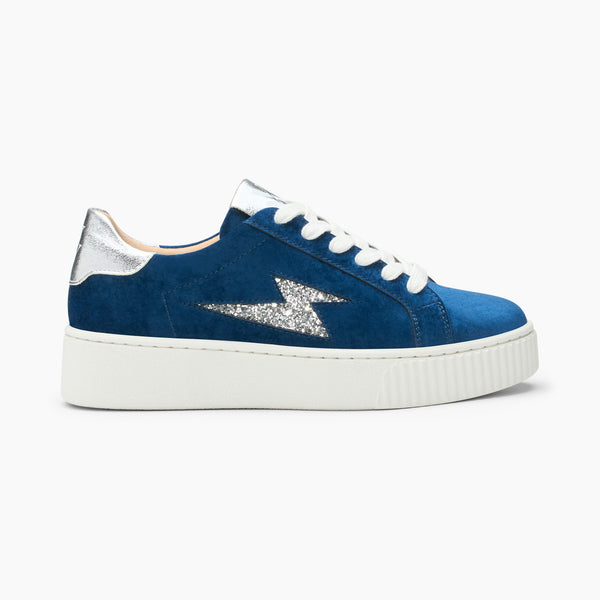 REF: BK2709BL- Dark blue velvet sneakers- Silver glitter lightning cutout- Rear patch in silver textured faux leather- White laces closure- Round toe- White textured soleHeel height: 4 cmPlatform height: 3 cmUpper height: 6 cm