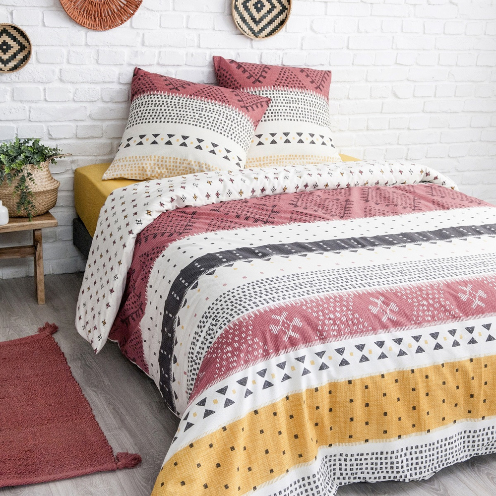 Parure de lit en polycoton réversible imprimé 57 fils blanc et terracotta comprenant 1 housse de couette + 2 taies d’oreiller 63x63cm.La parure de lit Chamarel s’inspire d’un endroit magique au c≈ìur de l’√Æle Maurice. Le temps d’une nuit, évadez-vous dans ses terres ocres, oscillant sur les draps entre le terracotta, le noir et quelques touches orangées. Puis restez-y pour la journée. Sa housse de couette réversible vous offre deux imprimés différents, pour prolonger votre voyage insulaire selon vos envies de décoration. Le linge de lit Chamarel est en polycoton – 52% polyester, 48% coton. Un tissage de 57 fils/cm¬≤ pour des nuits toutes douces. Facile d’entretien, le polycoton sèche et se défroisse facilement, pour encore plus de temps à vous prélasser dans vos draps lors des dimanches pluvieux.Notre parure est composée d’une housse de couette finition boutons qui sécurisera votre couette en toutes circonstances. Les taies d’oreiller assorties à la housse de couette et aux dimensions 63x63cm s’associent parfaitement avec le style coloré de ce linge de lit.A compléter avec nos drap-housse FUTURE HOME.COMPOSITIONS PRODUIT :‚Ä¢ Matière : 52% polyester, 48% coton‚Ä¢ Couleurs : Blanc et terracotta‚Ä¢ Densité fils : 57 fils/cm¬≤‚Ä¢ Certification : OEKO-TEX¬Æ‚Ä¢ Lavage : à 60¬∞ en machine‚Ä¢ 2 taies d’oreiller 63x63cmVous faites attention à l’environnement ? Ca tombe bien, nous aussi ! La parure de lit CHAMAREL vous est envoyée dans un pochon en tissu réutilisable, aux motifs de la housse de couette, et transformable en tote-bag une fois que vos draps trôneront fièrement sur votre lit. En savoir plus : ‚Ä¢ Ce produit labélisé STANDARD 100 by OEKO-TEX¬Æ – certificat n¬∞ 18.HPK48415 HOHENSTEIN HTTI suit un processus de fabrication certifié et contrôlé, respectueux de votre peau. ‚Ä¢ Le STANDARD 100 by OEKO-TEX¬Æ EST un label qui vous garantit que vos draps ne contiennent aucun produits toxiques ni pour votre santé, ni pour l’environnement.