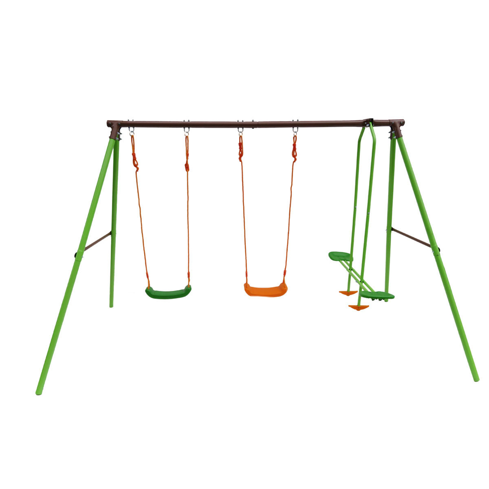 Matériaux:Acier – PE – PP.Dimensions (L x l x H cm):297 x 156 x 196 cm.Dimensions au sol :297 x 156 cm.Kit d’ancrage:Oui.Poids:30.5 kg.Agrès 1:1 Balan√ßoire : 48 x 16 x 168 cm – Assise : 39 x 16 cm – Polyéthylène.Agrès 2:1 Balan√ßoire : 48 x 16 x 168 cm – Assise : 39 x 16 cm – Polyéthylène.Agrès 3:1 Face à face : 25.5 x 118 x 174 cm – Assise : 25.5 x 19.5 – Polypropylène.Age:Age minimum conseillé : 3 ans – Poids maximum conseillé: 35 kg pour tous les agrès.Restriction d’usage:Hauteur d’installation minimum conseillée pour les agrès : 35 cm.Couleur:Vert.Colisage:1 colis : – 1,285 x 0,28 x 0,29 m, 32 kg.Nombre d’agrès:3.