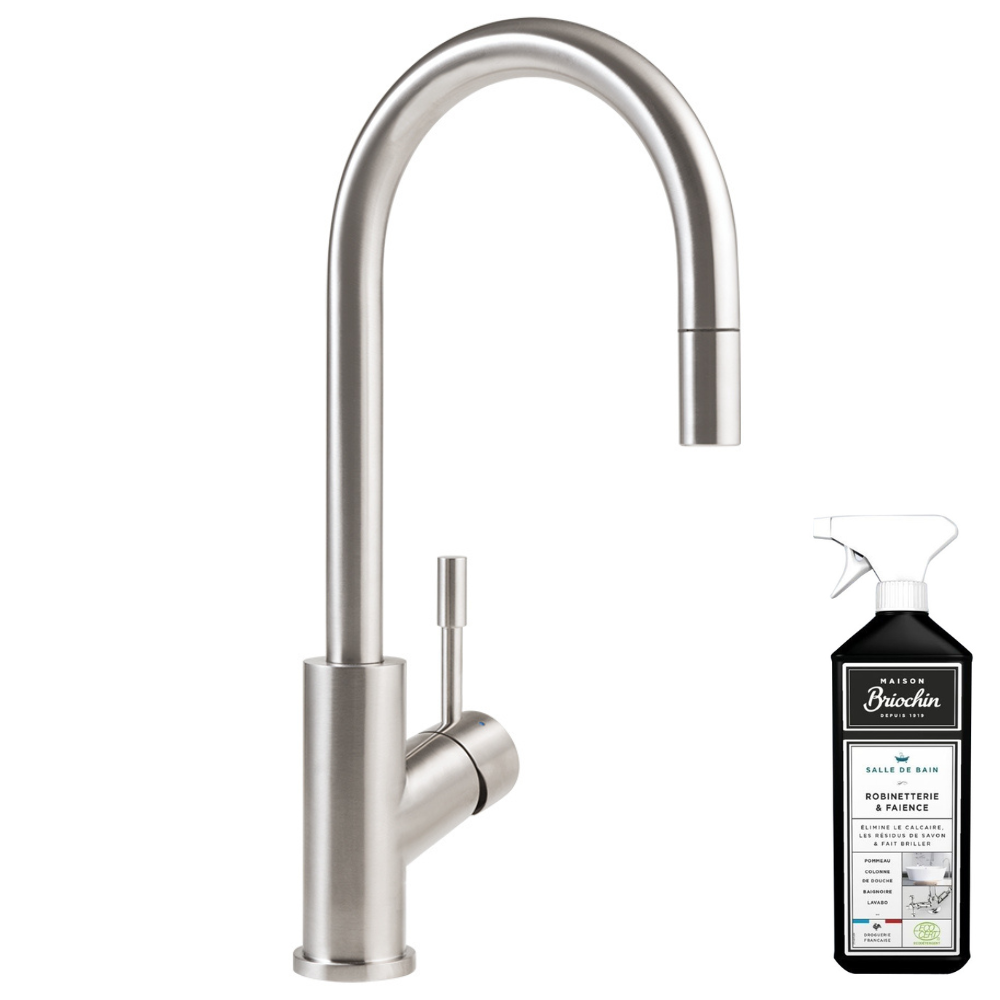 Avantages Hauteur offrant une liberté de mouvement, condition parfaite pour faciliter le nettoyage et remplir de grand récipientsDouchette extractible pour une fonctionnalité parfaiteJet confort : jet ventilé parfaitement calibré pour économiser de l’eau et assurer un bon lavagePivotement complet à 360¬∞ pour une flexibilité totale sur l’évierRevêtement anti-traces et anti-tachesInstallation simple et rapide gr√¢ce à des composants de haute qualité et standardisésRobinet de cuisine en acier inoxydable 100% exempt d’acide, de go√ªt et d’émissions pour un robinet robuste, durable, extrêmement hygiéniqueDesign moderne pour sublimer votre cuisineRevêtement PVD : la surface est résistante aux UV et aux chocsPeut-être installer directement devant un murOuverte à froid pour ne pas chauffer inutilement Caractéristiques techniques Longueur : 21,5 cmLargeur : 4,5 cmHauteur : 30,9 cmCollection : UmbrellaMatériel : Acier inoxydableCartouche : plastique avec bague en céramiqueRayon de pivotement : 360¬∞Angle d’ouverture du levier : 25¬∞Débit du jet confort : 11,5 L / minFlexibles fournis : 60 cm Avantages et caractéristiques du nettoyant BRIOCHINCertifié Ecocert : 99,9% d’origine naturelleParfum d’origine naturelleProduit 2 en 1 pour la robinetterie comme pour la fa√ØenceElimine le calcaire, les saletés et autres dépôtsFait brillerContenance : 750mLParfum : pinCertification EcocertIdéal pour : robinetterie, baignoire, receveur de douche, vasque, lavabo, lave-main, pare-bain, paroi de doucheTypes de surface : inox, céramique émaillée, acrylique, parcelaine, carrelages muraux