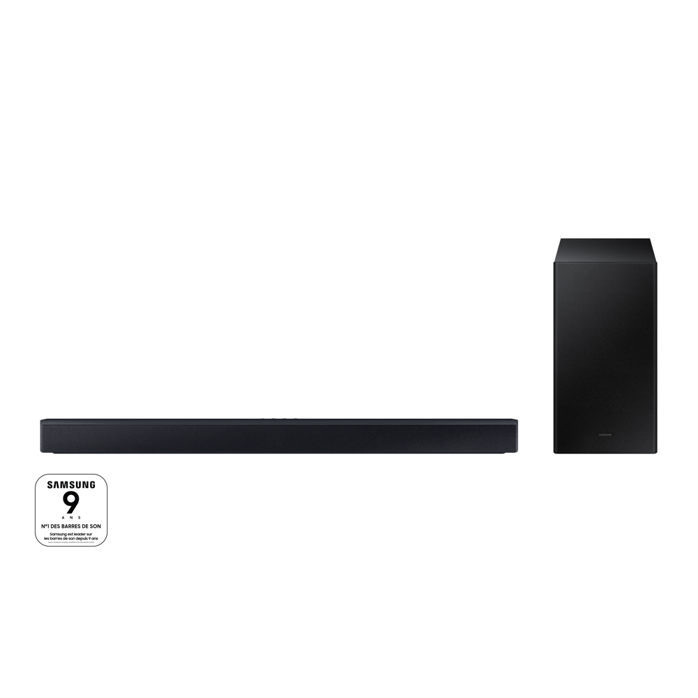 DTS Virtual:XUne immersion sonore en 3 dimensionsUn son surround 3D pour vous transporter au c≈ìur de l’action.Caisson de basse inclusDes basses profondes pour un son puissantLa barre de son C450 offre un son puissant avec son système 2.1Ch et son caisson de basse inclus. Un son riche et pure avec des basses profondes pour vous accompagner devant vos séries et films préférés.Mode Bass BoostPlus de basses pour de plus grandes sensationsBoostez les basses pour une expérience comme au cinéma. Activez le mode Bass Boost en un clic pour faire danser vos invités ou pour une soirée film mémorable.Adaptive Sound LiteUn son optimisé pour vos contenus favorisNe manquez plus aucun dialogue de vos séries et films préférés. Cette fonction analyse laudio scène par scène et optimise automatiquement le son afin d’entendre les voix clairement même quand le niveau sonore est faible.Mode JeuPlongez au c≈ìur de vos jeuxImmergez-vous dans l’univers de vos jeux vidéo avec un son 3D. La barre de son passe automatiquement en mode jeu lorsque vous allumez votre console. Profitez d’un son optimisé selon votre jeu.Mode nuitProfitez de vos films sans distractionsGr√¢ce au mode nuit, soyez s√ªrs de ne pas réveiller les enfants. Le mettre en marche baisse automatiquement le volume et compresse les basses.Mode voix claireUn son de qualité sans en perdre une mietteActivez le mode sonore pour optimiser l’EQ afin d’obtenir des pistes de voix claires et de faire ressortir les dialogues.Connexion BluetoothDites adieu aux c√¢blesConnectez facilement votre TV à votre barre de son via Bluetooth¬Æ.Télécommande uniqueAccès simplifié et rapideIl n’est plus nécessaire d’avoir plusieurs télécommandes, une seule vous suffit. Pilotez votre barre de son avec la télécommande universelle de votre téléviseur Samsung.Kit denceintes arrières sans filUne expérience home-cinémaLe kit d’enceintes arrières sans fil[1] vous permet de créer facilement un véritable son Surround, sans l’encombrement d’un seul fil[2]