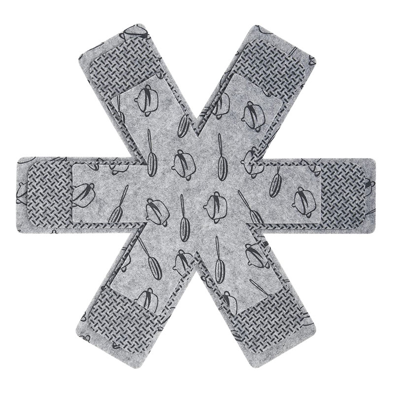 ProtectPan Protections, protège poêles et casseroles, fonctionnent sur poêles, sauteuses, casseroles, plats et bien d’autres ustensiles du quotidien.Avec ces protections protèges poêles et casseroles, vous préserverez tout ustensile de cuisine des chocs mais aussi placards et tiroirs de traces et rayures.Les casseroles qui s‚Äôentrechoquent s‚Äôab√Æment plus vite. Certains revêtements sont plus sensibles que d‚Äôautres et nécessitent certaines protections. Glisser ces patins en feutrine anti rayures, protection ProtectPan, est indispensable pour optimiser la durée de vie de toutes poêles et casseroles.Autre avantage, en évitant l’accumulation de traces sur vos fonds de tiroirs, ces protections ProtectPan rendent le nettoyage de n’importe quel rangement plus facile. Un petit coup de chiffon humide suffira. Vous n’aurez plus qu’à chasser la poussière.Vous allez enfin pouvoir empiler vos poêles et casseroles sans qu’elles s’ab√Æment et sans faire un vacarme monstre dans la cuisine ! De plus, avec ces protections, vous gagnerez de la place dans vos placards !La Qualité du Tissu ProtectPanLa feutrine anti-rayures est sans surprise la matière la plus qualitative sur ce genre de produit de protection. Il s’agit d’un tissu doux et résistant, suffisamment épais pour être utilisé comme dessous de plat.L‚Äô√âpaisseur de la Feutrine Anti RayuresGage de qualité et de durabilité, ces protections d’ustensiles de cuisine ProtectPan ont une épaisseur idéale permettant d’optimiser le niveau de protection et d’atténuer au mieux le bruit des chocs entre poêles et casseroles.Les Dimensions des ProtectionsProtectPan, protections poêles et casseroles, sont parfaites si vous possédez de nombreux ustensiles de cuisine de tailles différentes. Elles possèdent trois tailles différentes, en forme de flocons. N‚Äôoubliez pas qu‚Äôil vous sera toujours possible de redécouper ces pièces de tissu si vous les trouvez trop grandes.L‚ÄôEntretien de la FeutrineLe pack de 6 ProtectPan est lavable à la main avec de l‚Äôeau chaude et du savon. Ces flocons de feutrine anti-rayures devront sécher à l’air libre afin de conserver toutes leurs propriétés de protection.Caractéristiques :x6 protège poêlesCouleur : grisMatériau : tissu non tissé – feutrine3 tailles différentes : 26 – 35.5 – 38 cmPoints forts :Diversité des taillesFeutrine résistante et durablePossibilité de découpeBonne épaisseurEn Bref !Protections adaptées aux ustensiles de cuisine qui empêchent frottements et rayures durant leur stockage ou leur transport.Simple à utiliser, il suffit de placer les feutrines entre vos ustensiles de cuisine pour les séparer. ProtectPan évite traces et rayures sur surfaces antiadhésives, empêche la casse, l’écaillage et prolonge la durée de vie de vos ustensiles de cuisine.Feutrines con√ßue pour protéger les ustensiles de cuisine et de cuisson en grès, verre, céramique, y compris les bols et assiettes. Protection ProtectPan s’utilisent aussi comme dessous de plats.Fabriqués en matériau de haute qualité, les protections protège poêles ProtectPan sont durables.