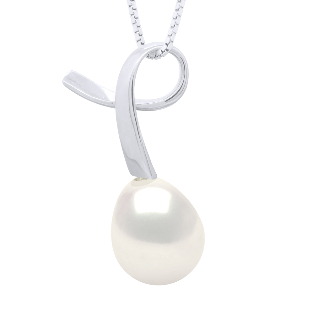 Pendentif Bélière “Fantaisie” en Or Blanc 375 Millièmes orné d’une véritable Perle de Culture d’Eau Douce Poire 8-9 mm – Colori Blanc Naturel – Livré avec Certificat d’Authenticité et de Garantie – * Ce Pendentif vous sera livré avec une chaine Argent 925 – Longueur 42 cm – Offerte – Frabriqué en FRANCE